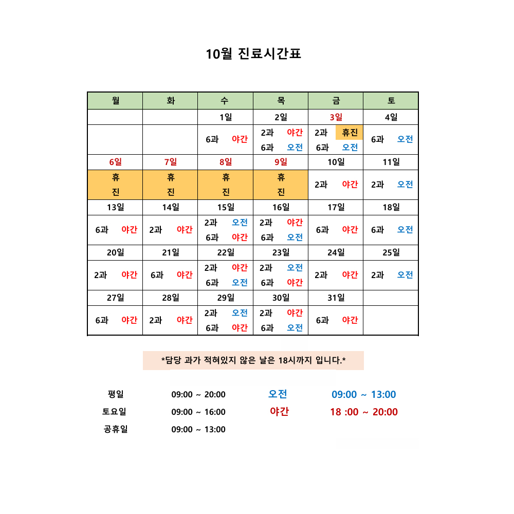 10월 진료시간표입니다 !! 페이지 정보 작성자 관리자 댓글 0건 조회 239회 작성일 25-09-30 15:06 목록 본문 10월 진료시간표입니다 이전글11월 진료시간표입니다 !! 25.10.28 다음글8월 진료시간표입니다 !! 25.06.26