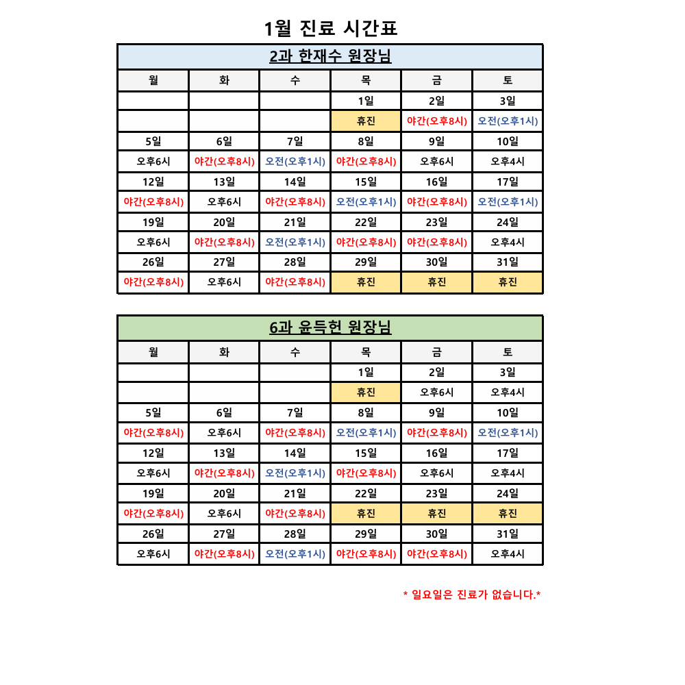 1월 진료시간표입니다 !! 페이지 정보 작성자 관리자 댓글 0건 조회 411회 작성일 25-12-24 11:33 목록 본문 1월 진료시간표입니다 !! 이전글2월 진료시간표입니다 !! 26.01.21 다음글12월 진료시간표입니다 !! 25.12.01